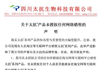 關于太抗?產(chǎn)品未授權任何網(wǎng)絡銷售的聲明發(fā)布日期:2017.05.15點擊量:6687 -