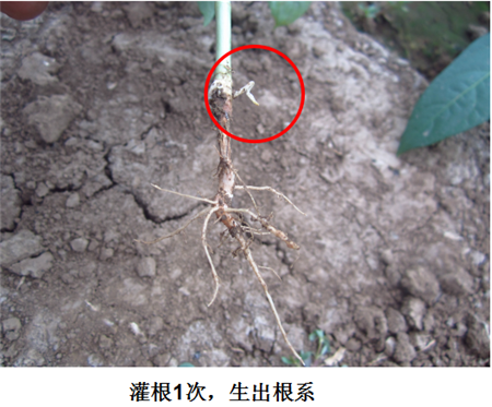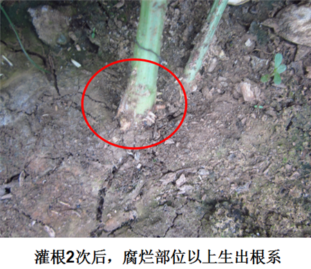 試驗結(jié)果:根腐發(fā)病部位上方長出新根,植株恢復健康生長。