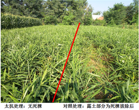 試驗結(jié)果:整個生育期使用3遍“枯木逢春”組合之后,大姜的死棵得到很好的控制,防效達到90%以上;