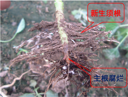 試驗結(jié)果:根腐發(fā)病部位上方長出新根,植株恢復健康生長。