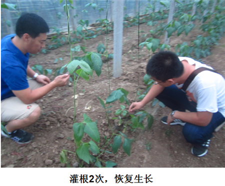 試驗結(jié)果:跟蹤示范過程中,農(nóng)戶于師傅對“枯木逢春”組合的效果一直都非常滿意,示范區(qū)沒有死棵現(xiàn)象,植株長勢也非常好,尤其是在促進根系生長方面效果尤為突出。
