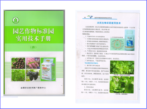 自2012年取得三證后正式推向市場(chǎng)以來,由于安全可靠效果好,太抗生物農(nóng)藥能夠在供給側(cè)為健康生活提供基礎(chǔ),奠立了太抗在生物農(nóng)藥行業(yè)領(lǐng)軍前行的良好格局。由于產(chǎn)品推廣示范應(yīng)用的良好效果,太抗生物農(nóng)藥入選農(nóng)業(yè)部關(guān)于印發(fā)《農(nóng)企合作共建示范基地深入推進(jìn)<到2020年農(nóng)藥用量零增長(zhǎng)行動(dòng)實(shí)施方案計(jì)劃>實(shí)施方案》(農(nóng)農(nóng)【2015】61號(hào)),被全國(guó)農(nóng)業(yè)技術(shù)推廣服務(wù)中心編入《園藝作物標(biāo)準(zhǔn)園使用技術(shù)手冊(cè)》,也被成都市植物檢疫站編入《成都市生物農(nóng)藥應(yīng)用手冊(cè)》中第一個(gè)推薦使用的生物農(nóng)藥。